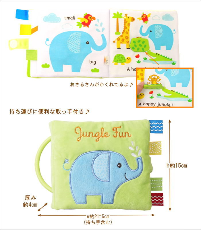 かわいい布絵本 ・Spec 商品名 ジャングルファン 対象年齢 6ヶ月〜 主な素材 ポリエステル サイズ w約19.5cm×d約4cm×h約15cm 重さ 約90g 備考 ※手洗いできるので清潔に保つことができます。