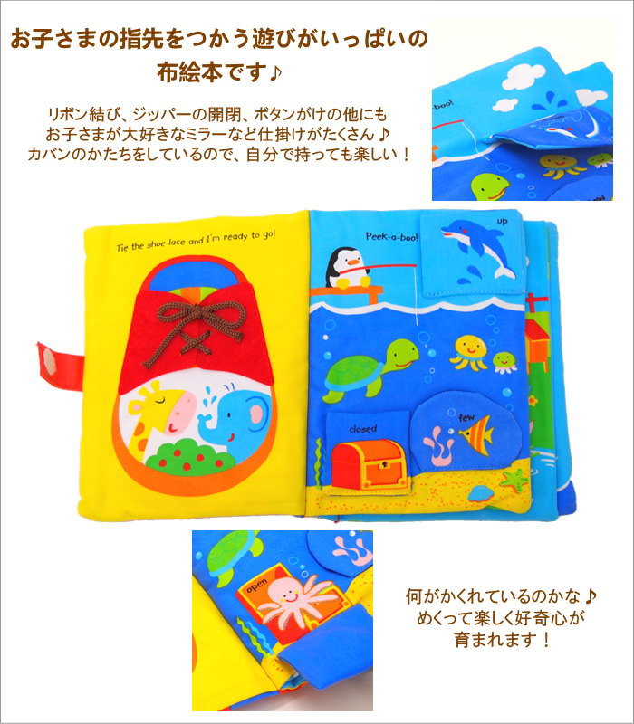 リボン結び、ジッパーの開閉、ボタンがけの他にも お子さまが大好きなミラーなどの仕掛けが盛りだくさん♪