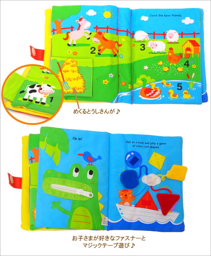 しかけ以外にも牧場・海・深海とさまざまな場面が登場し、いろいろな 生き物との出会いで好奇心が育まれます! かばん型で持ち運びもしやすく、お部屋の中ではもちろん おでかけにも最適♪