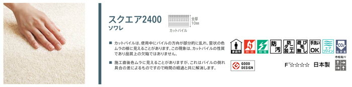 東リ ファブリックフロア スクエア2400 ソワレ ペット 洗える 床暖対応吸着 タイルカーペット 500mm×500mm 厚さ10mm【枚売り 10枚以上1枚単位】 送料無料※北海道・沖縄・離島は20枚毎に700円(税別) 商品詳細 東リ ファブリックフロア スクエア2400FF2401 FF2402 FF2403 FF2404 FF2405 FF2406 FF2407 FF2408 FF2409ソワレ 500mm×500mm 厚さ8mm【枚売り 10枚以上1枚単位】 送料無料※北海道・沖縄・離島は20枚毎に700円(税別) 品名 住宅用タイルカーペット 品番 FF2401 FF2402 FF2403 FF2404 FF2405 FF2406 FF2407 FF2408 FF2409 柄名 スクエア2400 ソワレ サイズ 500mm×500mm 厚さ10mm 旧→新品番対照表 旧品番と同一品番・FF2408 FF2409のみ新品番 パイル カットパイル 販売単位 10枚以上1枚単位での販売(アソート可) 送料について 送料無料 ※北海道・沖縄・離島は20枚毎に700円(税別) 商品について ※1枚単位の販売価格となります。
