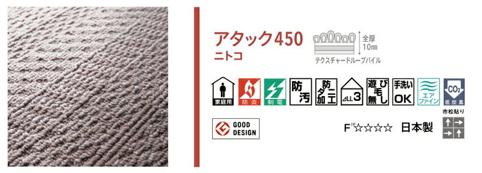 東リ ファブリックフロア アタック450 ニトコ ペット 洗える 床暖対応 吸着 タイルカーペット 400mm×400mm 厚さ10mm【枚売り 10枚以上1枚単位】 送料無料 ※北海道・沖縄・離島は20枚毎に700円(税別) 商品詳細 東リ ファブリックフロア アタック450 ニトコAK4501 AK4502 AK4503 AK4504 400mm×400mm 厚さ10mm 【枚売り 10枚以上1枚単位】 送料無料 ※北海道・沖縄・離島は20枚毎に700円(税別) 品名 住宅用タイルカーペット 品番 AK4501 AK4502 AK4503 AK4504 柄名 アタック450 ニトコ サイズ 400mm×400mm 厚さ10mm 旧→新品番対照表 新品番 パイル テクスチャードループパイル 販売単位 10枚以上1枚単位での販売(アソート可) 送料について 送料無料 ※北海道・沖縄・離島は20枚毎に700円(税別) 商品について ※1枚単位の販売価格となります。